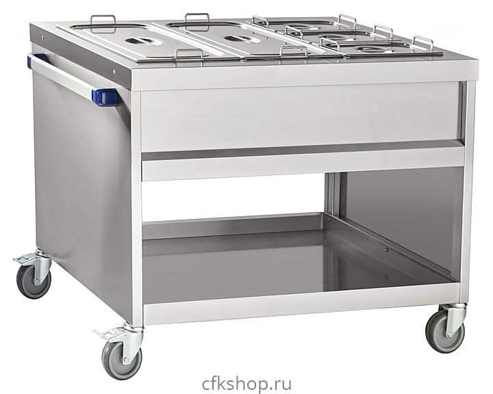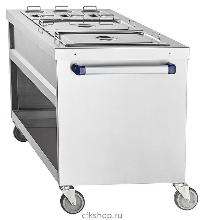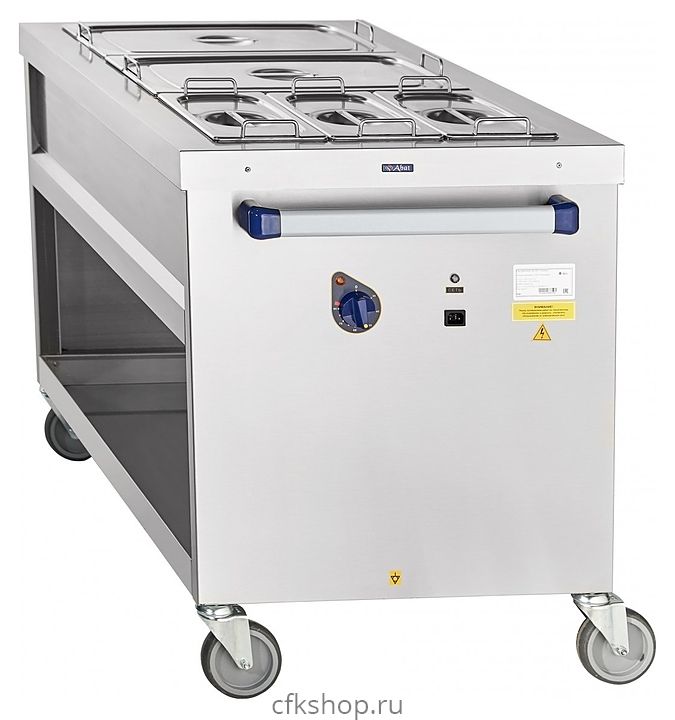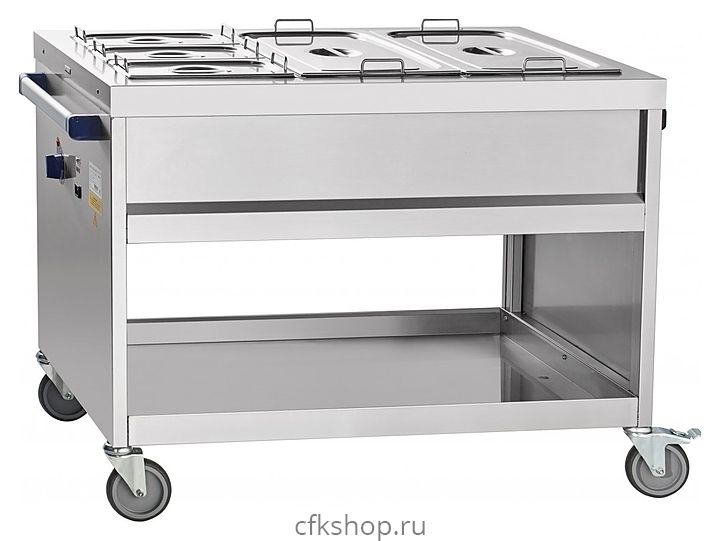 Электрический передвижной мармит Abat ЭМК-70М предназначен для демонстрации, кратковременного хранения и поддержания вторых блюд в горячем состоянии в составе технологических линий горячих цехов и в линиях раздачи самообслуживания на предприятиях общественного питания и торговли. Модель оснащена терморегулятором, полкой с бортом для кухонного инвентаря и принадлежностей, 2 лампами освещения и 4 повортными колесами, два из которых с тормозным механизмом. Облицовка выполнена из нержавеющей стали.