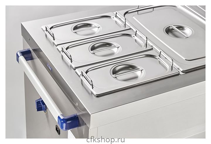 В комлпект поставки входят 2 гастроемкости GN 1/1 глубиной 150 мм и 3 гастроемкости GN 1/3 глубиной 150 мм с ручками и крышками.