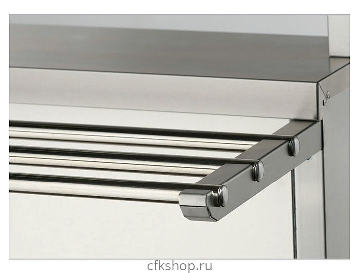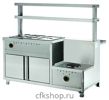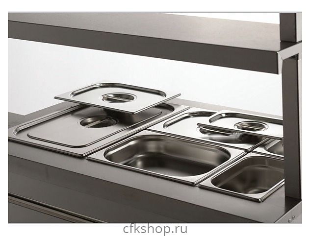 Мармит Gabino MMU-15/7 используется в составе линии раздачи Gabino Riga для демонстрации и кратковременного хранения готовых блюд, продуктов питания, напитков и посуды на предприятиях общественного питания и торговли. Модель оснащена конфоркой, паровой ванной, 2-ярусной полкой с подсветкой, набором гастроёмкостей, нейтральным шкафом с полками и распашными дверцами. Корпус выполнен из нержавеющей стали.