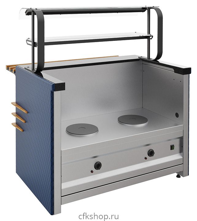 Внимание! На фото аналогичная модель другого размера с 2 конфорками, каменной столешницей и направляющей для подносов.