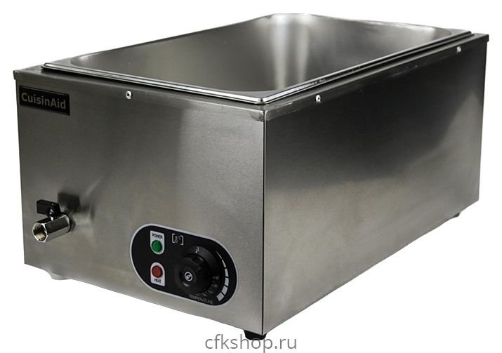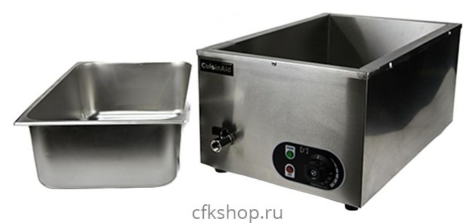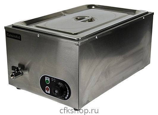 Электрический мармит CuisinAid CD-BM-1/1 предназначен для подогрева вторых блюд и поддержания их оптимальной температуры на предприятиях общественного питания и торговли. Модель оснащена ванной с открытым трубчатым электронагревателем (ТЭНом), краном для слива и электромеханической панелью управления.