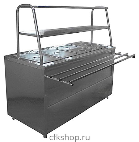Мармит Пищевые Технологии Лира-Профи МЭП-2Б-П/ЛП-1500 предназначен для кратковременного сохранения в горячем состоянии вторых блюд, соусов и гарниров в составе линий раздач или самостоятельно на предприятиях общественного питания и торговли. Модель оснащена прямоугольной ванной с гнездами для установки гастроемкостей, 2 полками для тарелок, направляющими для подносов и регулируемыми по высоте ножками. Корпус выполнен из нержавеющей стали.
