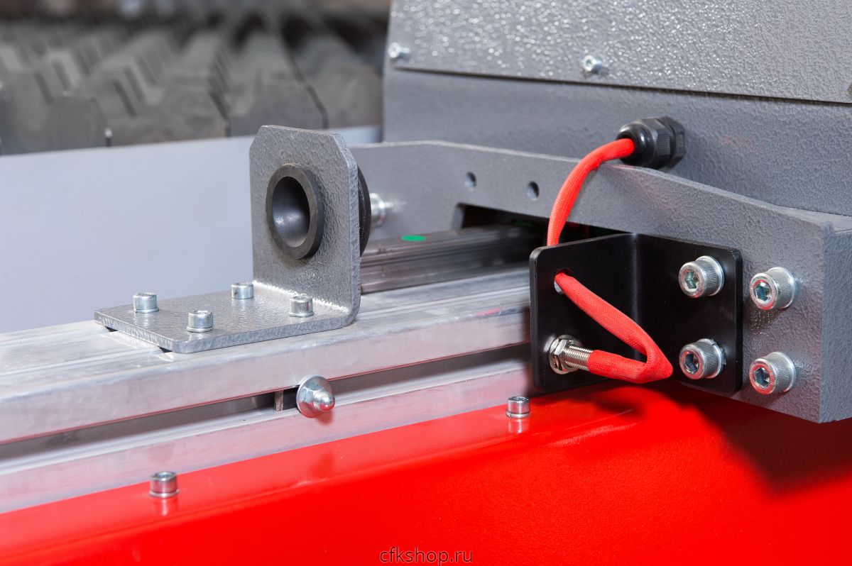 На рельсовых направляющих расположены зубчатые рейки, по которым перемещаются ведущие зубчатые колеса приводов продольного хода. Нижнее расположение зубьев на рейке обеспечивает защиту зубчатого зацепления от попадания пыли, что повышает ее долговечность. Система компенсации зазора в паре шестерня-рейка обеспечивает простую эксплуатацию оборудования без специального обслуживания данного узла.