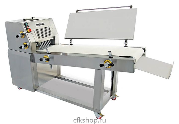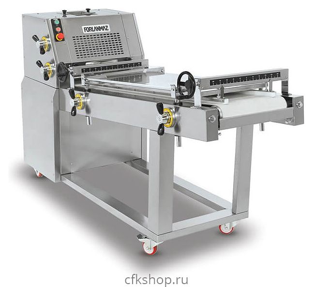 Тестозакаточная машина Porlanmaz Bakery Machinery PMDM 400 предназначена для формирования тестовых заготовок в цилиндрическую форму заданной длины и диаметра при помощи закаточных плит на предприятиях общественного питания и торговли. Модель оснащена плитой, 4 валиками и колесами, облегчающими передвижение. Изделие выполнено из нержавеющей стали.
