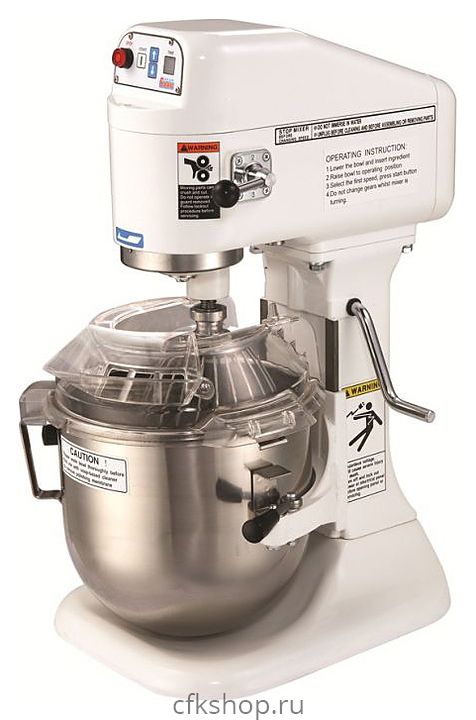 Месильный орган вращается вокруг своей оси и оси дежи, тем самым обеспечивая получение однородной массы. Миксер оснащен механическим подъемом дежи.