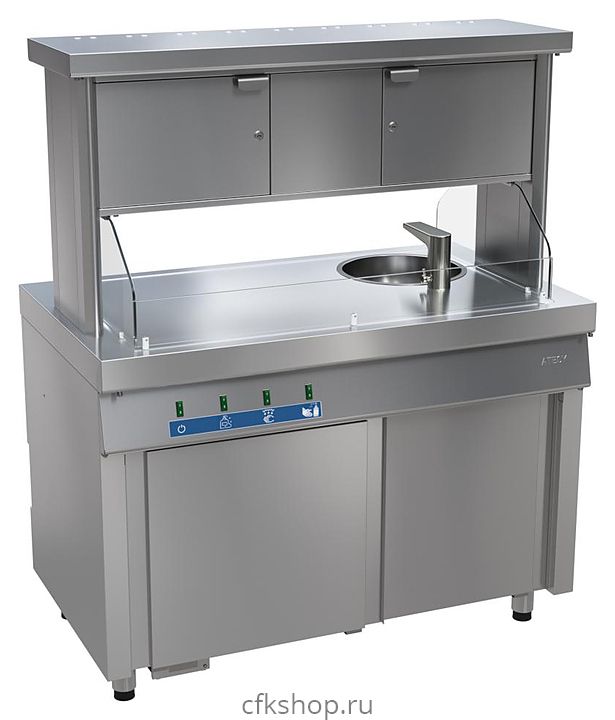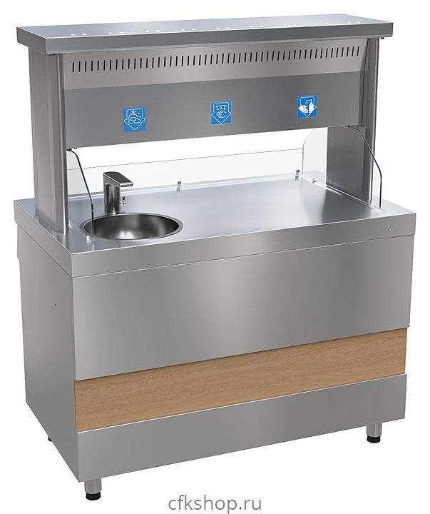 Модуль дезинфекции рук ATESY Ривьера МДР-1200-02 используется в составе линии раздачи Ривьера на предприятиях общественного питания и торговли для санитарной обработки рук посетителей. Модель оснащена мойкой и сушилкой для рук, а также автоматическими дозаторами антисептика и жидкого мыла. Все конструктивные элементы выполнены из коррозионностойкой стали, гарантирующей длительную эксплуатацию.