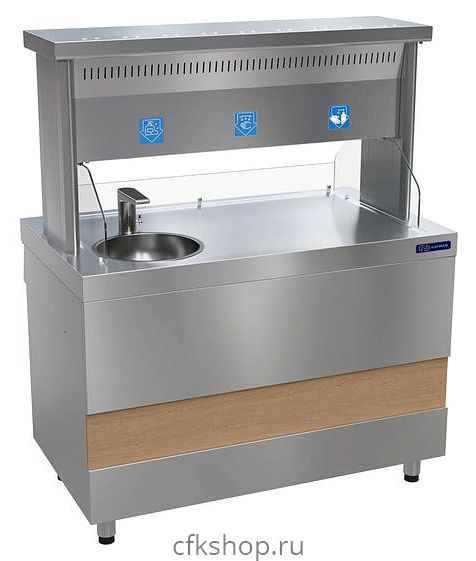 Модуль дезинфекции рук KAYMAN МДР-1200-02 используется в составе линии раздачи PRESTO на предприятиях общественного питания и торговли для санитарной обработки рук посетителей. Модель оснащена автоматическим бесконтактным дозатором жидкого мыла, автоматическим бесконтактным дозатором анисептика, электросушилкой для рук, раковиной с сенсорным смесителем и регулируемыми по высоте опорами. Корпус выполнен из нержавеющей стали AISI 430.