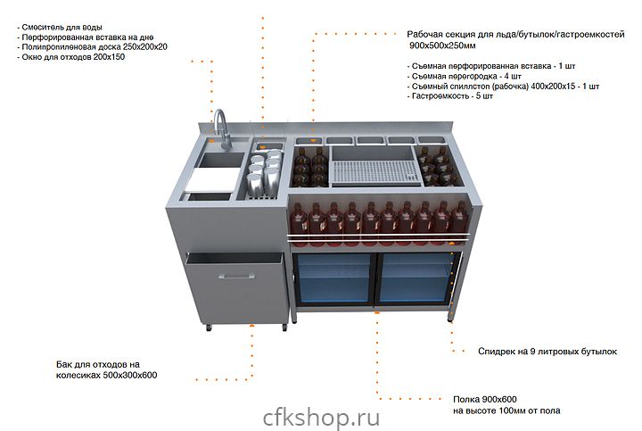 Барный модуль BARMADE Номер 2 предназначена для организации барного места на предприятиях общественного питания и торговли. Модуль состоит из зоны мойки, секции для инвентаря, рабочей секции и полки под холодильные шкафы. Модель оснащена регулируемыми по высоте ножками. Корпус выполнен из нержавеющей стали AISI430 толщиной 1 и 1,5 мм.