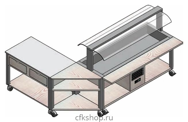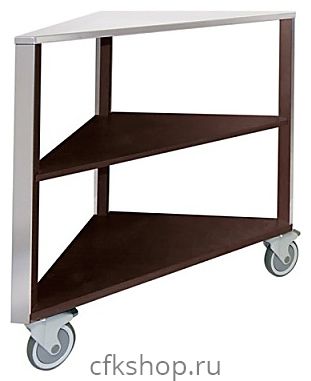 Корпус модуля выполнен из шпонированных деревянных панелей. Деревянные ножки покрыты полированной нержавеющей листовой сталью. Конструкция оснащена 3 поворотными колесами, 2 из которых снабжены тормозами.