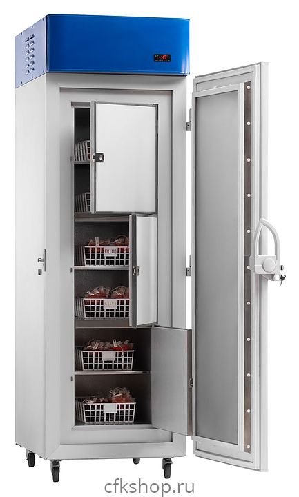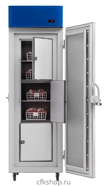 Медицинский морозильник POZIS ММШ-350 предназначен для хранения замороженной плазмы крови, ферментов и биологических образцов на станциях перливания крови, в лабораториях научно-исследовательских институтов, ветеринарных клиниках и других учреждениях здравоохранения. Модель оснащена панелью управления с кнопками и экраном, 1 общей дверью с замком, 3 внутренними дверями, 5 металлическими полками и 4 колесами.