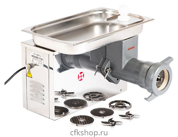 Мясорубка ТОРГТЕХМАШ ТМ-50 используется на предприятиях общественного питания и торговли для измельчения мяса и рыбы при производстве фарша, а также повторного измельчения котлетной массы и набивки колбас. Модель оснащена функцией Реверс, исключающей необходимость разборки мясорубки при попадании костей в горловину и наматывании жил на шнек. Все детали, контактирующие в процессе работы с продуктами, выполнены из безопасной нержавеющей стали.