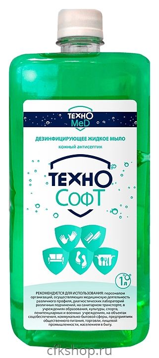 Антибактериальное жидкое мыло ТехноМед ТехноСофт, 1 л используется совместно с дезинфекторами для рук или путем нанесения на увлажненную губку или мочалку на предприятиях общественного питания и торговли, в медицинских и лечебно-профилактических организациях различного профиля, в учреждениях образования, социальной сферы, культуры, спорта и отдыха, производственных цехах, торговых центрах, салонах красоты и отелях для гигиенической и санитарной обработки кожных покровов. Средство обладает пролонгированным антимикробным действием, увлажняет и смягчает кожу. Поставляется в бутылке без дозатора.