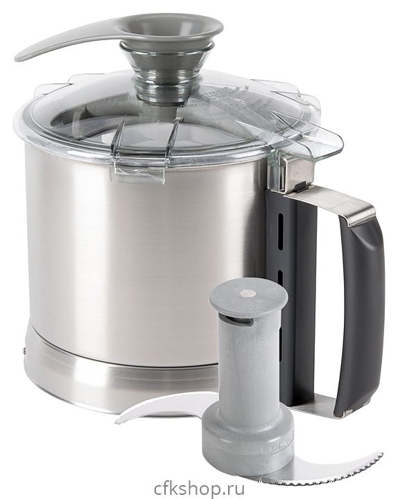 В комплект поставки входят чаша с эргономичной ручкой, нож со съёмным колпачком для очистки, крышка и разборный из 2х частей скребок.