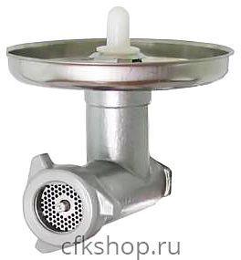 Насадка ТОРГМАШ ММ устанавливается на универсальные кухонные машины для приготовления мясного и рыбного фаршей. Механизм состоит из корпуса, в котором вращается шнек. Подрезная решетка, двусторонние ножи и ножевые решетки с разными диаметрами отверстий насажены на палец шнека. Изделие оснащено загрузочной тарелкой, толкачом, хвостовиком и спиральными ребрами, удерживающими от проворачивания мяса.