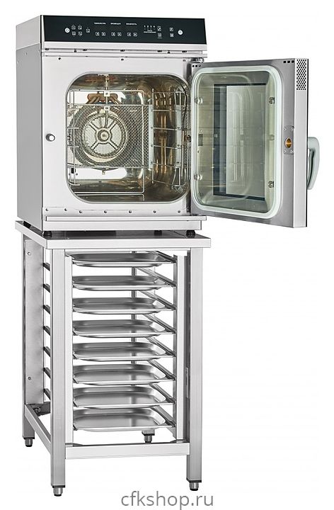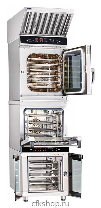 Благодаря небольшим габаритным размерам пароконвектомат подходит для помещений с ограниченным пространством и размещается на столе или подставке. Пароконвектомат может устанавливаться в колонну с конвекционной печью КПП-4-1/2П или КПП-4-1/2Э и расстоечным шкафом ШРТ-4-02 при использовании установочных комплектов КСП6-1/2П.