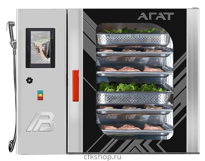 Пароконвектомат Восход Агат 6 предназначен для обжаривания, приготовления на пару, бланширования, запекания и других видов тепловой обработки продуктов на предприятиях общественного питания и торговли. Модель оснащена микроконтроллерной системой управления с сенсорной панелью, термощупом и внутренним освещением. Дверь выполнена из термостойкого ударопрочного стекла (внутреннее низкоэмиссионное стекло имеет высокие теплоотражающие свойства), уплотнение - из силиконового резинового профиля.