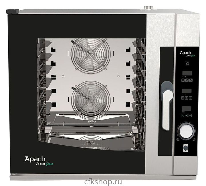 Конвекционная печь Apach AB6QD предназначена для выпекания или разогрева кондитерских и хлебобулочных изделий, готовых блюд, замороженных или предварительно выдержанных в расстоечном шкафу заготовок из теста на предприятиях общественного питания и торговли. Подсветка камеры светодиодная, вмонтированная в дверь. Камера легко чистится благодаря закругленным углам. Корпус выполнен из нержавеющей стали, дверца - из двойного закаленного стекла.