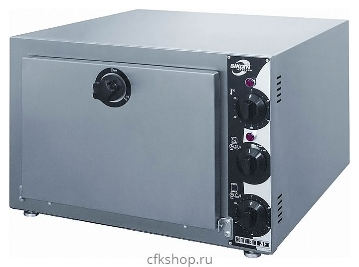Печь-коптильня Sikom КР-1.30 предназначена для производства продуктов горячего копчения. Модель оснащена электромеханической панелью управления с сигнальными индикаторами нагрева, терморегулятором, таймером включения ТЭНа для нагрева щепы и таймером для установки времени копчения,1 глухой дверью, 2 полками-решетками и съемным лотком для щепы. Корпус выполнен из нержавеющей стали.