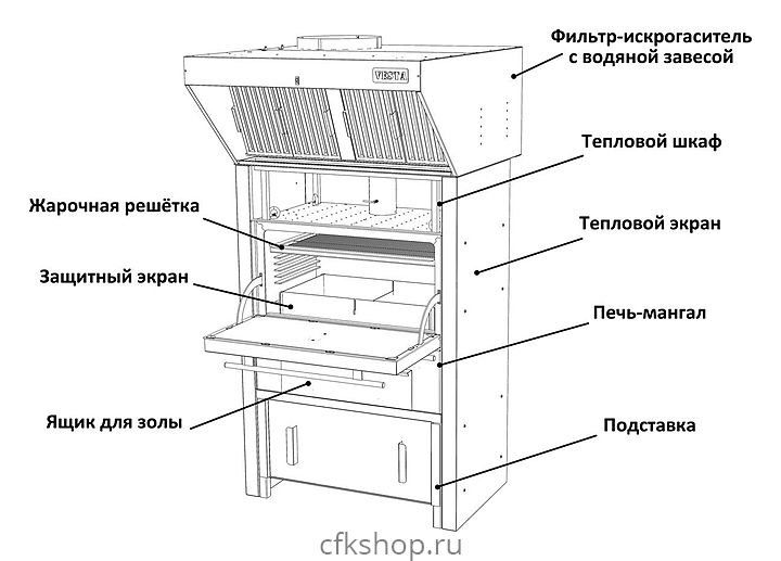 В комплект поставки входят термометр, зольный ящик, защитный экран, жарочная решетка из нержавеющей стали, щипцы, кочерга, выход дымовой трубы с верхней задвижкой.