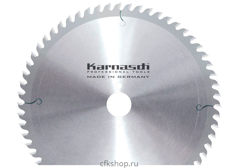 Karnasch артикул 111400. Пильные диски по дереву Материал: Более низкое количество зубьев: для древесины, в том числе ламинированной, ДСП. Среднее количество зубьев: для древесины, ДСП, мебельного щита, ламинированных с одной стороны панелей из перечисленных материалов. Высокое количество зубьев: для качественных чистых распилов в древесине и древесных плитах, ламинированных с одной или двух сторон.