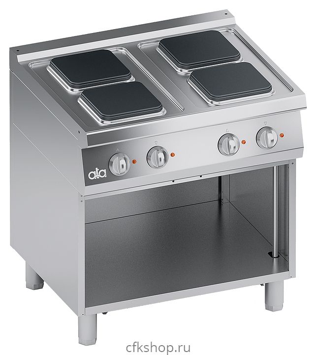 Электрическая плита АТА ELECTRIC RANGE 4 PLATES + OPEN CABINET предназначена для приготовления блюд в наплитной посуде на предприятиях общественного питания и торговли. Модель оснащена температурными датчиками внутри конфорок, обеспечивающими безопасность работы и регулируемыми по высоте ножками. Корпус и ножки выполнены из нержавеющей стали, рабочая поверхность и передняя панель - из нержавевеющей стали AISI 304, атермические ручки - из пластика с трафаретной печатью по краям, квадратные конфорки - из чугуна.