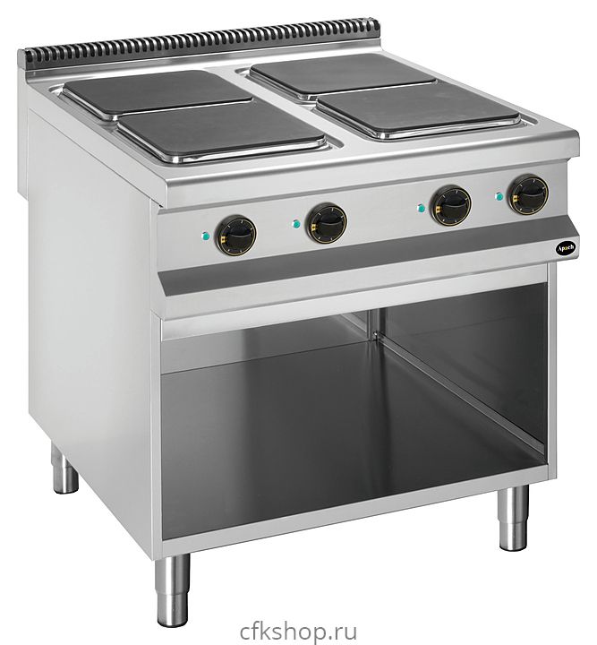 Электрическая плита Apach APRE-89P/PL 900-й серии предназначена для приготовления различных блюд из мяса, птицы, рыбы и овощей в наплитной посуде на предприятиях общественного питания и торговли. Модель оснащена электромеханической панелью управления, быстро нагревающимися конфорками, гидроизолированной прессованной поверхностью и открытой подставкой с регулируемыми по высоте ножками. Корпус, рабочая поверхность, панель управления и вытяжная решетка выполнены из нержавеющей стали AISI 304, боковые и задняя панели - из нержавеющей стали AISI 430.