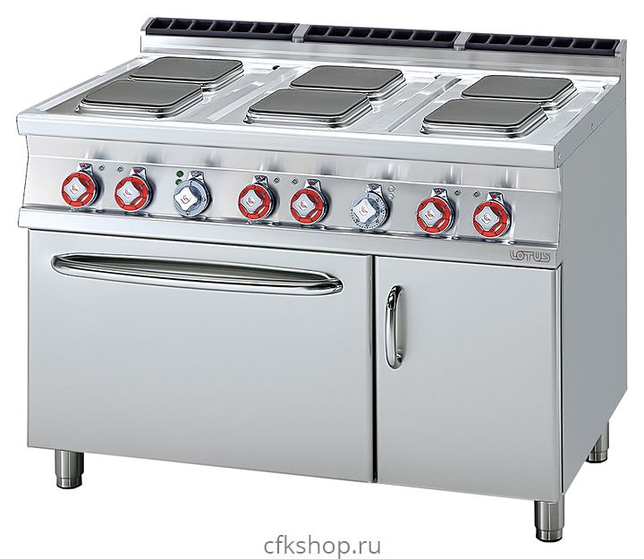 Плита электрическая Lotus CFQ6-712ETV предназначена для приготовления различных блюд в наплитной посуде, выпечки пиццы, пирогов, кексов и др. на предприятиях общественного питания и торговли. Модель оснащена 7-позиционным переключателем с регулировкой температуры, световыми индикаторами, сигнализирующими о включении конфорок, и регулируемыми ножками. Мощность нижних и верхних блоков ТЭНов жарочного шкафа регулируется отдельно. Духовка обладает возможностью принудительной конвекции воздуха.