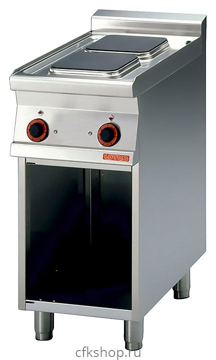 Плита электрическая Lotus PCQ-74ET предназначена для приготовления различных блюд в наплитной посуде на предприятиях общественного питания и торговли. Модель оснащена 7-позиционным переключателем с регулировкой температуры, световыми индикаторами, сигнализирующими о включении конфорок, и регулируемыми ножками. В нейтральном шкафу можно хранить посуду, кухонный инвентарь и продукты, не требующие специального температурного режима.