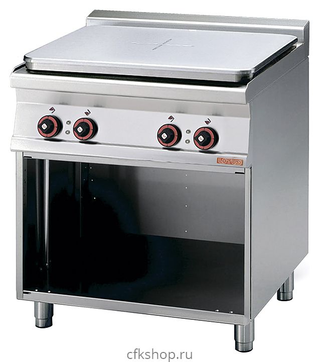 Плита электрическая Lotus TP-78ET предназначена для приготовления различных блюд в наплитной посуде на предприятиях общественного питания и торговли. Модель оснащена 4-позиционным терморегулятором (до 450 °C), световыми индикаторами, сигнализирующими о включении конфорок, и регулируемыми ножками. В нейтральном шкафу можно хранить посуду, кухонный инвентарь и продукты, не требующие специального температурного режима.