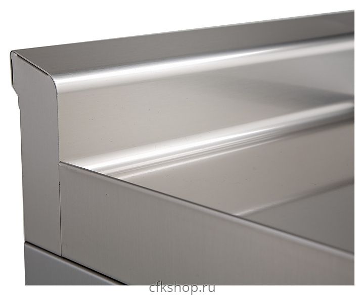 Корпус выполнен из нержавеющей стали 18/10 AISI 304 с зеркальной полировкой, цельной столешницей толщиной 1,2 мм, скругленными углами и хромированными деталями.