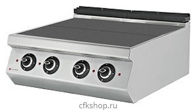 Электрическая плита Tatra TER.87 700 серии предназначена для жарки мяса, птицы, рыбы, овощей и быстрого разогрева полуфабрикатов на предприятиях общественного питания и торговли. Модель оснащена электромеханической панелью управления, 4 низкими чугунными конфорками и регулируемыми ножками. Корпус выполнен из нержавеющей стали.
