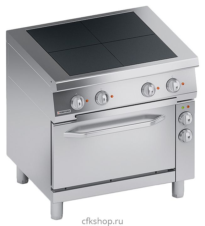 Напольная электрическая плита VEROTERM VT7RUE10FV используется на предприятиях общественного питания и торговли для приготовления широкого ассортимента блюд в наплитной посуде. Модель оснащена электромеханической панелью управления, рабочей поверхностью с 4 независимыми зонами нагрева, духовым шкафом с верхним и нижним трубчатыми электронагревателями (ТЭНами) и откидной дверью с горизонтальной рукояткой. Корпус и внутренняя облицовка шкафа выполнены из нержавеющей стали, конфорки – из чугуна.