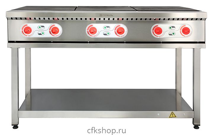 Плита электрическая Термаль ПЭ-6 предназначена для приготовления различного вида блюд на предприятиях общественного питания и торговли. Контактные части и коммутационные провода защищены от попадания жидкости, благодаря чему обспечивается устойчивость к влажности. Прямоугольные легкосъемные цельнолитые конфорки гарантируют равномерный нагрев, в них также залиты ТЭНы, что предохраняет их от контакта с воздухом и, как следствие этого, от окисления.