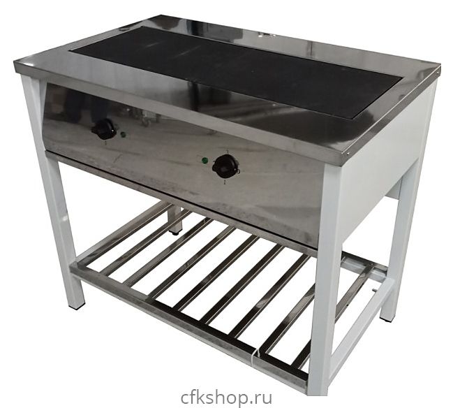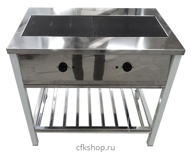 Электрическая плита ЦМИ ПЭ-2 используется на предприятиях общественного питания и торговли для приготовления первых, вторых и третьих блюд в наплитной посуде, а также для жарки полуфабрикатов из мяса, рыбы, овощей. Рабочая поверхность, фронтальная панель и полка-решетка изготовлены из нержавеющей стали, ножки - из профильной трубы.