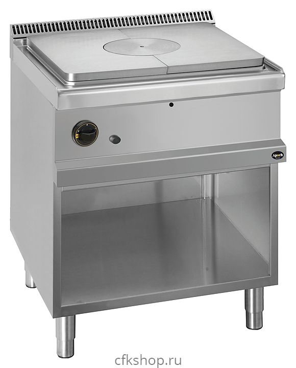 Газовая плита Apach APRGS-77P 700-й серии для приготовления различных блюд из мяса, птицы, рыбы и овощей в наплитной посуде на предприятиях общественного питания и торговли. Модель оснащена электромеханической панелью управления и открытой подставкой с регулируемыми по высоте ножками. Температура рабочей поверхности в центре достигает 500 °C и уменьшается к краям до 200 °C. Корпус, рабочая поверхность, панель управления и вытяжная решетка выполнены из нержавеющей стали AISI 304, жарочная поверхность и горелка - из чугуна.