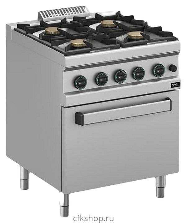 Газовая плита Apach APRG-77FG/PL 700-й серии предназначена для приготовления различных блюд из мяса, птицы, рыбы и овощей в наплитной посуде на предприятиях общественного питания и торговли. Модель оснащена электромеханической панелью управления, гидроизолированной прессованной поверхностью и регулируемыми по высоте ножками. Корпус, рабочая поверхность, панель управления и вытяжная решетка выполнены из нержавеющей стали AISI 304, боковые и задняя панели - из нержавеющей стали AISI 430, решетки выполнены из чугуна, горелки - из эмалированного чугуна, распределительные головки - из латуни.