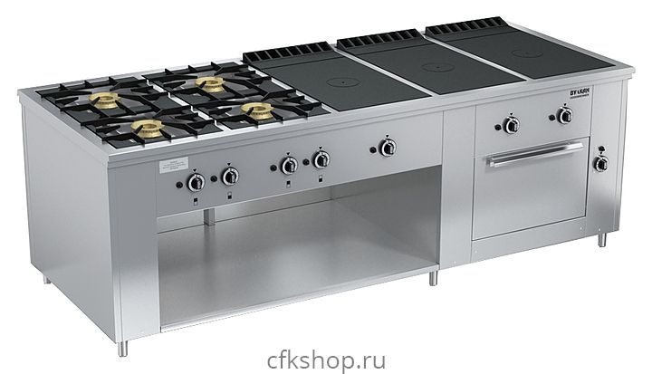Газовая плита Вулкан ПРГ-IIA-10-3 ДШ Maxi предназначена для приготовления первых, вторых и третьих блюд в наплитной посуде, выпечки хлебобулочных и кондитерских изделий на предприятиях общественного питания и торговли. Модель оснащена 4 секционными и 3 сплошными горелками, газ-контролем, пьезорозжигом и запальной горелкой. Корпус выполнен из нержавеющей стали.