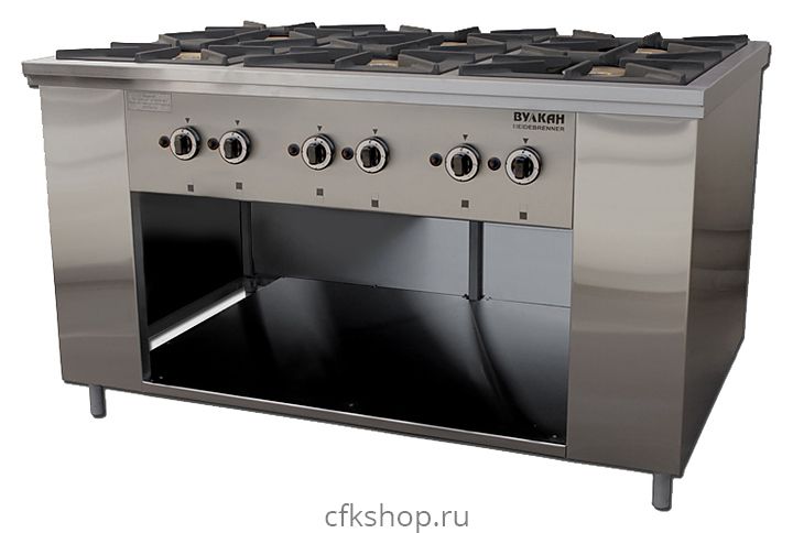 Газовая плита Вулкан ПРГ-IIA-6 Maxi предназначена для приготовления первых, вторых и третьих блюд в наплитной посуде на предприятиях общественного питания и торговли. Модель оснащена газ-контролем, пьезорозжигом и запальной горелкой. Корпус выполнен из нержавеющей стали, решетки - из чугуна, газовые горелки - из латуни.