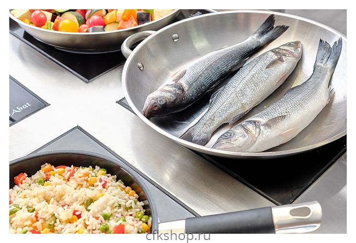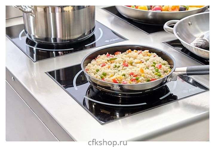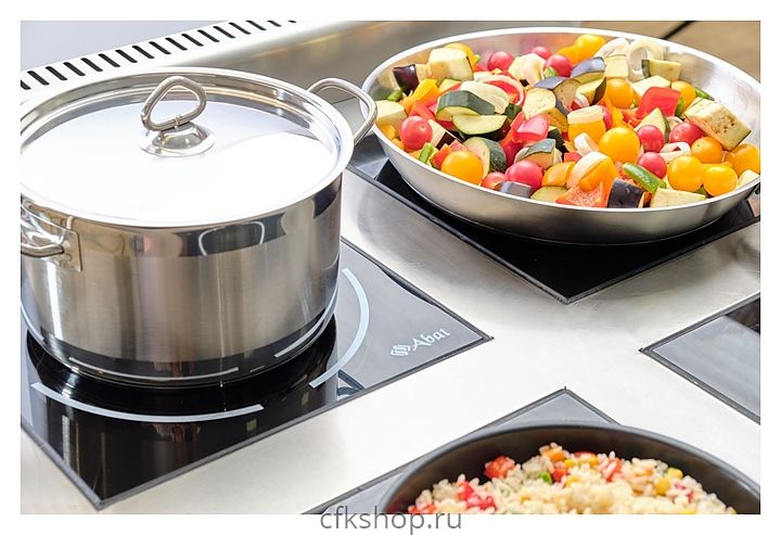 Может использоваться посуда из нержавеющей стали или алюминия с ферромагнитным дном, чугунная посуда.