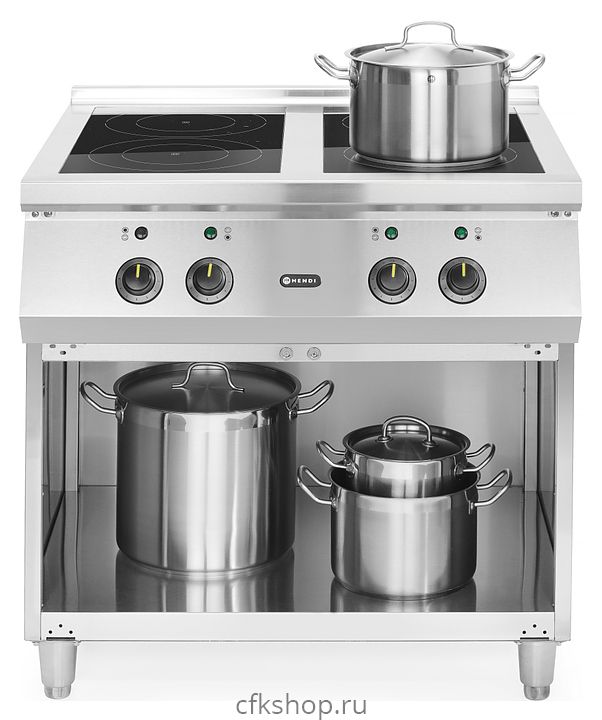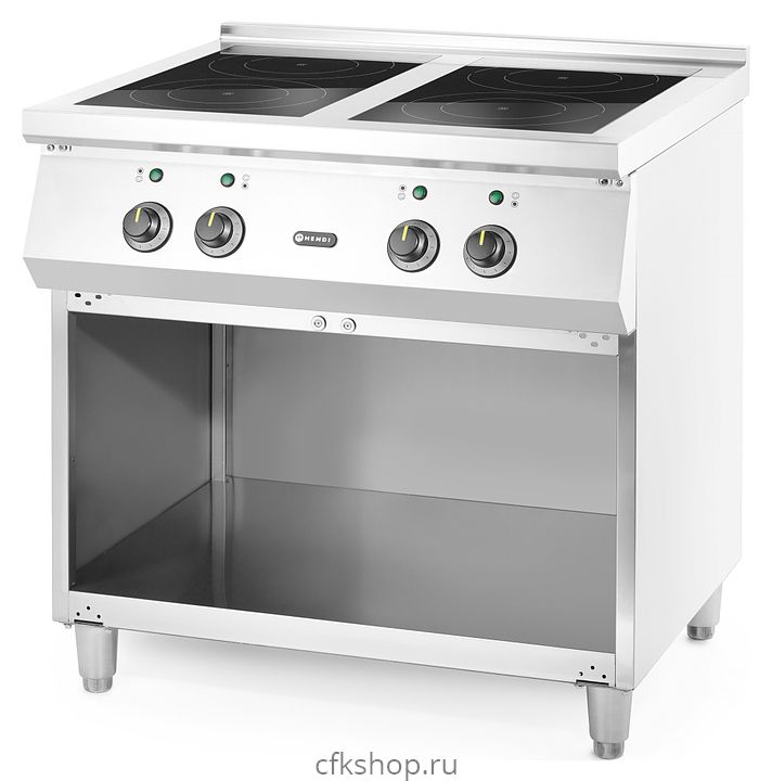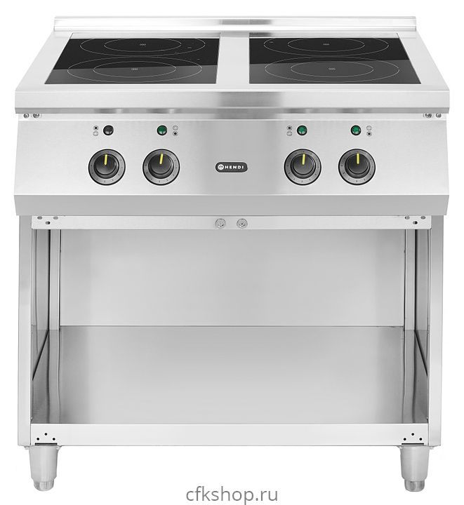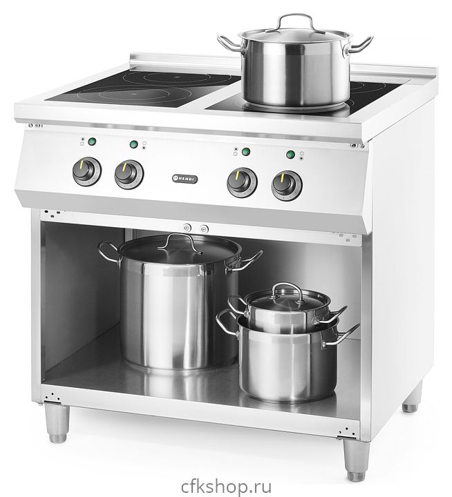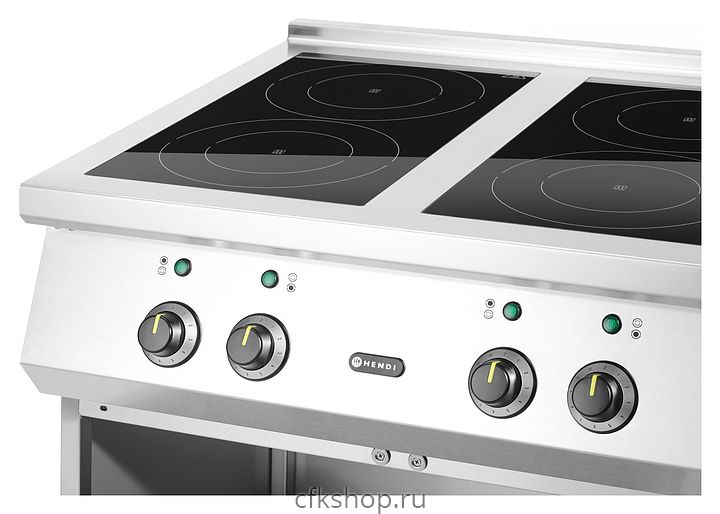 Индукционная плита HENDI 237687 предназначена для одновременного приготовления и быстрого разогрева нескольких блюд в отелях, офисах и домашних условиях. Модель оснащена 4 независимыми ручками управления, полкой для хранения кастрюль, сковородок или других принадлежностей и регулируемыми по высоте ножками. Корпус выполнен из прочной нержавеющей стали 18/8 и усилен каркасом, варочные панели - из закаленного стекла.