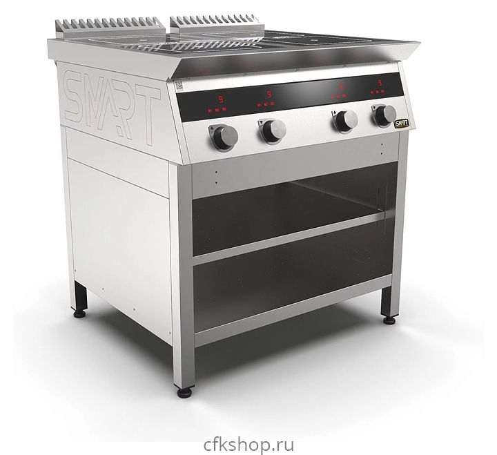 Индукционная плита SMART INDUCTION C94-3N предназначена для приготовления и быстрого разогрева блюд на предприятиях общественного питания и торговли. Модель оснащена электронно-механической панелью управления с индикацией, съемным жировым фильтром для отделения жира и влаги от поступающего внутрь аппарата воздуха и регулируемыми по высоте ножками. Корпус, столешница и воздуховод выполнены из нержавеющей стали AISI430, рабочая поверхность - из стеклокерамики, передняя панель - из нержавеющей стали.