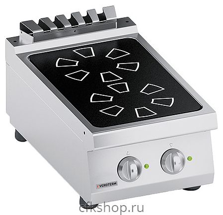 Настольная индукционная плита VEROTERM VT7CIE05TT используется на предприятиях общественного питания и торговли для приготовления широкого ассортимента блюд в наплитной посуде. Принцип работы основан на непосредственном нагреве металлической посуды создаваемыми высокочастотным магнитным полем индуцированными вихревыми токами. Модель оснащена 2 варочными зонами, фронтальной электромеханической панелью управления и дисплеями индикации на рабочей поверхности. Корпус выполнен из нержавеющей стали AISI 430, рабочая поверхность – из высококачественной стеклокерамики черного цвета (Швейцария).