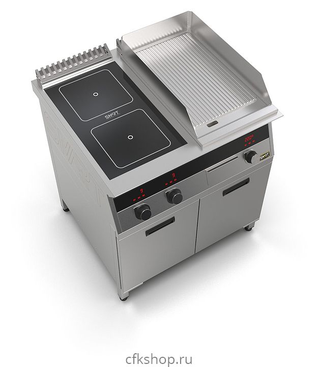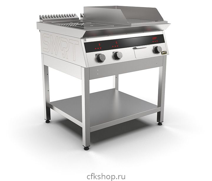 Комбинированная индукционная плита SMART INDUCTION K74-3KRN предназначена для приготовления и быстрого разогрева блюд на предприятиях общественного питания и торговли. Модель оснащена электронно-механической панелью управления с цифровой индикацией и сенсорными кнопками, 2 съемными жировыми фильтрами для отделения жира и влаги от поступающего внутрь аппарата воздуха, ящиком для сбора жира и регулируемыми по высоте ножками. Корпус и столешница выполнены из нержавеющей стали AISI430, рабочая поверхность плиты - из стеклокерамики, рабочая поверхность гриля и передняя панель - из нержавеющей стали.