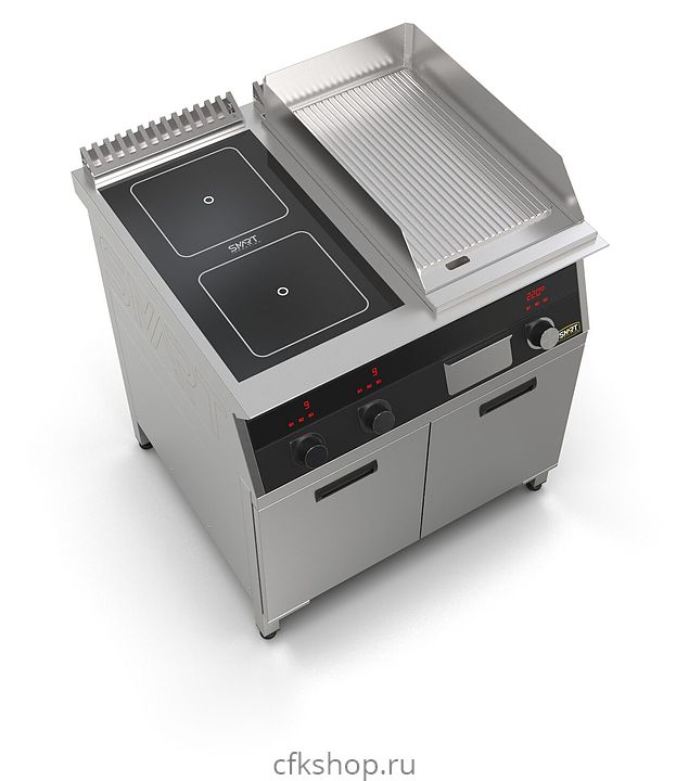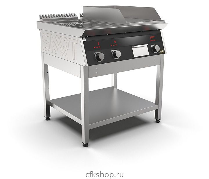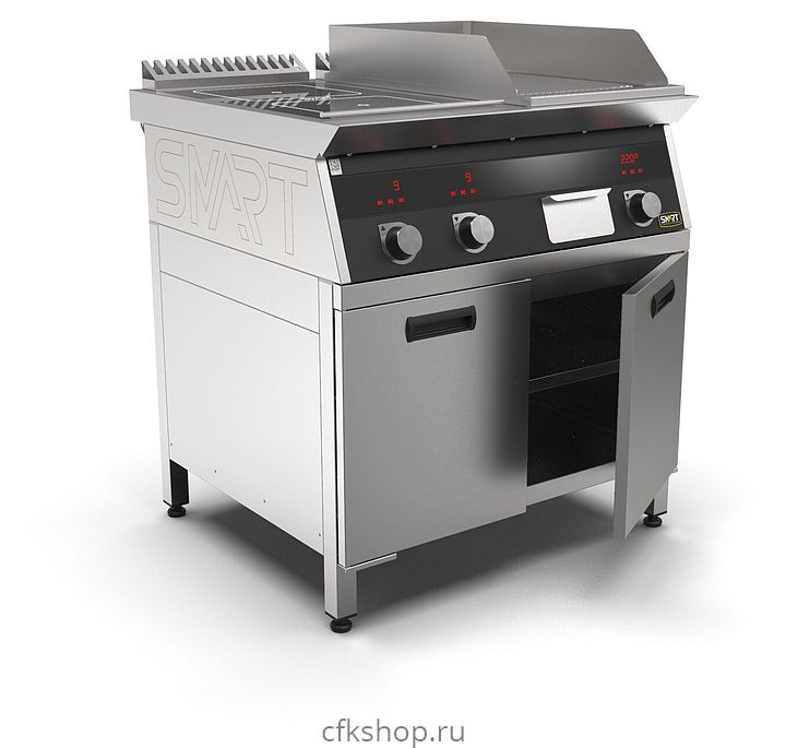Комбинированная индукционная плита SMART INDUCTION K74-5KRB предназначена для приготовления и быстрого разогрева блюд на предприятиях общественного питания и торговли. Модель оснащена электронно-механической панелью управления с цифровой индикацией и сенсорными кнопками, 2 съемными жировыми фильтрами для отделения жира и влаги от поступающего внутрь аппарата воздуха, ящиком для сбора жира и регулируемыми по высоте ножками. Корпус и столешница выполнены из нержавеющей стали AISI430, рабочая поверхность плиты - из стеклокерамики, рабочая поверхность гриля - из нержавеющей стали, передняя панель имеет стойкое полимерное покрытие черного цвета.