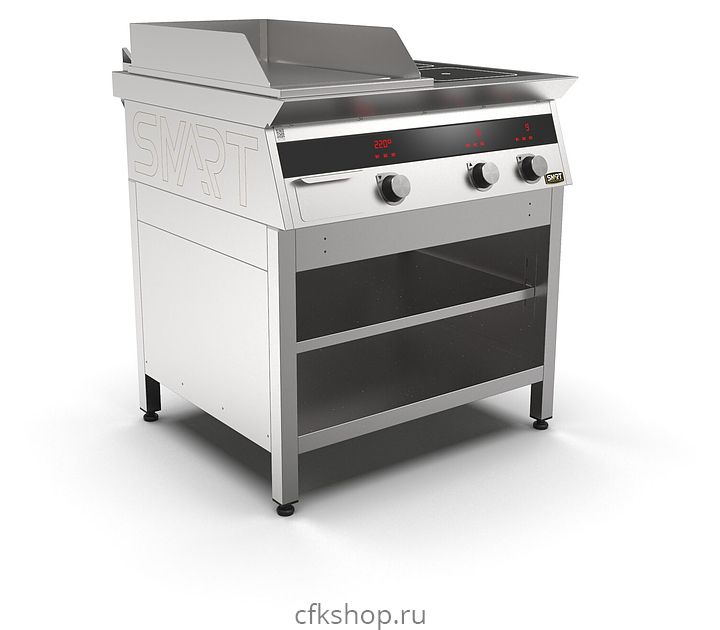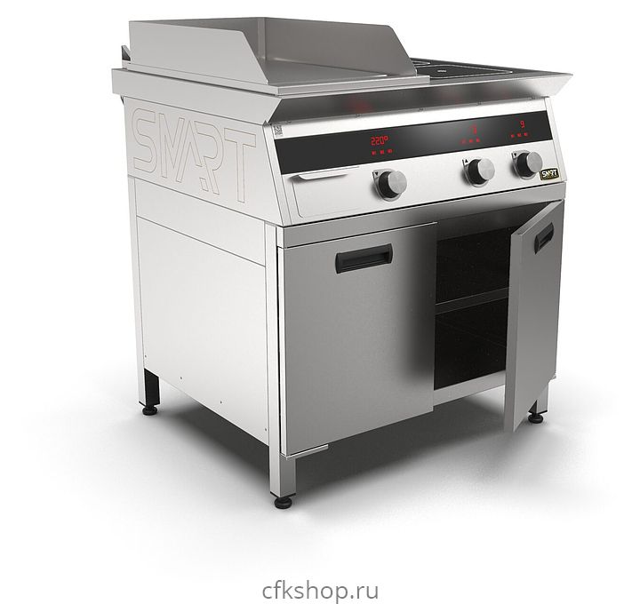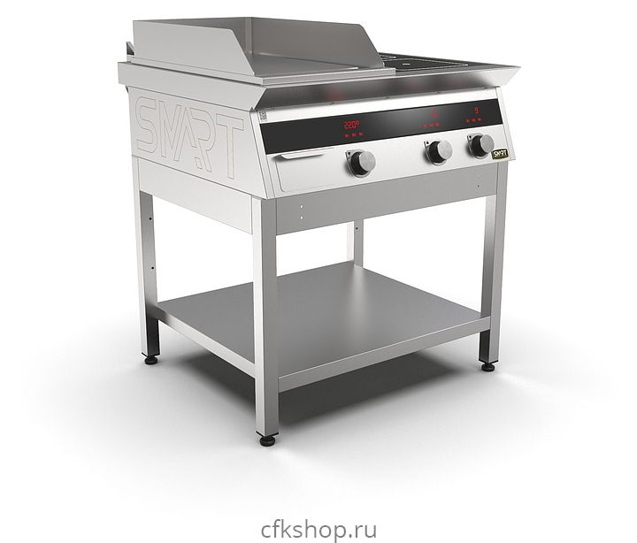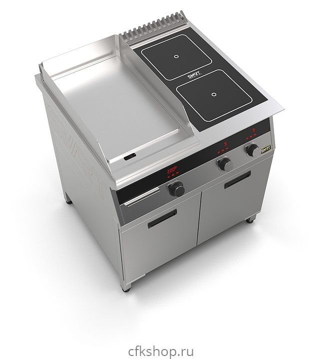 Комбинированная индукционная плита SMART INDUCTION K74-5PKN предназначена для приготовления и быстрого разогрева блюд на предприятиях общественного питания и торговли. Модель оснащена электронно-механической панелью управления с цифровой индикацией и сенсорными кнопками, 2 съемными жировыми фильтрами для отделения жира и влаги от поступающего внутрь аппарата воздуха, ящиком для сбора жира и регулируемыми по высоте ножками. Корпус и столешница выполнены из нержавеющей стали AISI430, рабочая поверхность плиты - из стеклокерамики, рабочая поверхность гриля и передняя панель - из нержавеющей стали.