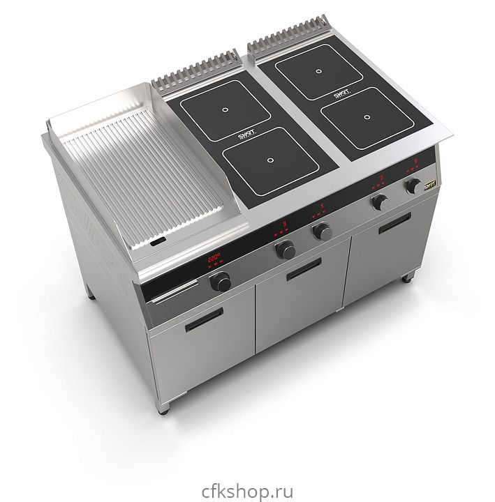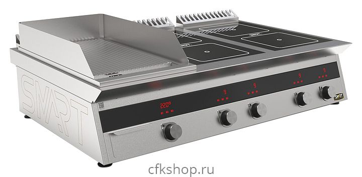 Комбинированная индукционная плита SMART INDUCTION K76-35RKN предназначена для приготовления и быстрого разогрева блюд на предприятиях общественного питания и торговли. Модель оснащена электронно-механической панелью управления с цифровой индикацией и сенсорными кнопками, 3 съемными жировыми фильтрами для отделения жира и влаги от поступающего внутрь аппарата воздуха, 2 ящиками для сбора жира и регулируемыми по высоте ножками. Корпус и столешница выполнены из нержавеющей стали AISI430, рабочая поверхность плиты - из стеклокерамики, рабочая поверхность гриля и передняя панель - из нержавеющей стали.
