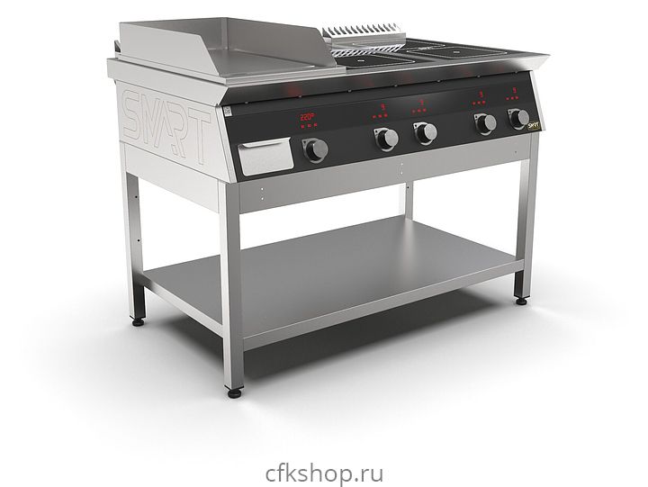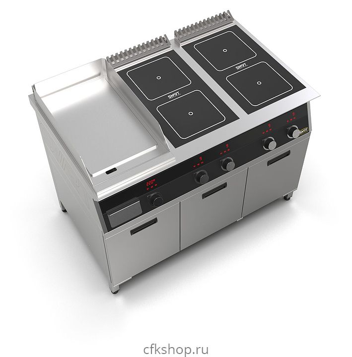 Комбинированная индукционная плита SMART INDUCTION K76-3PKB предназначена для приготовления и быстрого разогрева блюд на предприятиях общественного питания и торговли. Модель оснащена электронно-механической панелью управления с цифровой индикацией и сенсорными кнопками, 3 съемными жировыми фильтрами для отделения жира и влаги от поступающего внутрь аппарата воздуха, 2 ящиками для сбора жира и регулируемыми по высоте ножками. Корпус и столешница выполнены из нержавеющей стали AISI430, рабочая поверхность плиты - из стеклокерамики, рабочая поверхность гриля - из нержавеющей стали, передняя панель имеет стойкое полимерное покрытие черного цвета.