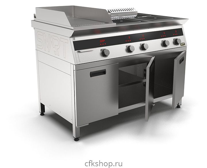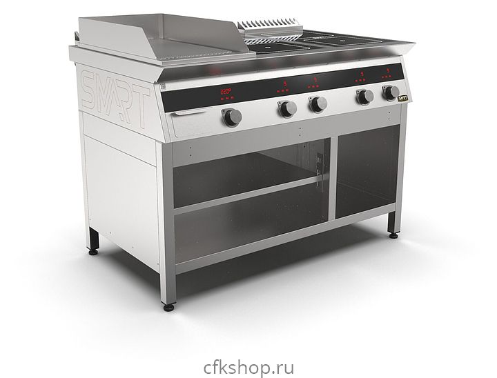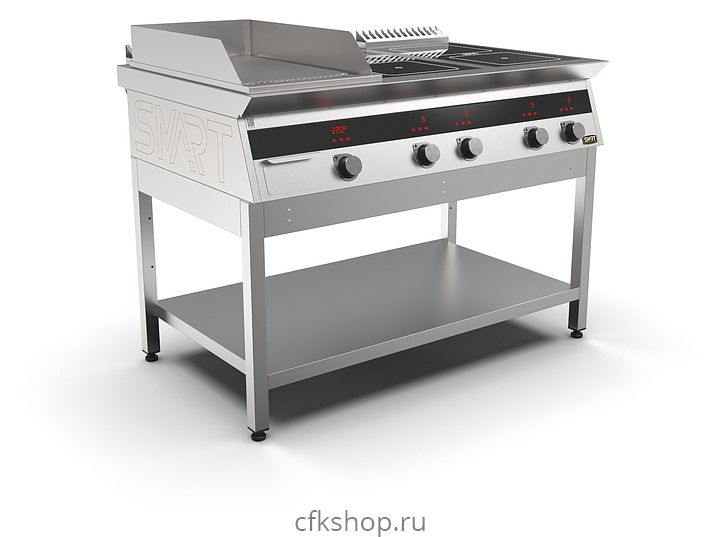 Комбинированная индукционная плита SMART INDUCTION K76-3RKN предназначена для приготовления и быстрого разогрева блюд на предприятиях общественного питания и торговли. Модель оснащена электронно-механической панелью управления с цифровой индикацией и сенсорными кнопками, 3 съемными жировыми фильтрами для отделения жира и влаги от поступающего внутрь аппарата воздуха, 2 ящиками для сбора жира и регулируемыми по высоте ножками. Корпус и столешница выполнены из нержавеющей стали AISI430, рабочая поверхность плиты - из стеклокерамики, рабочая поверхность гриля и передняя панель - из нержавеющей стали.