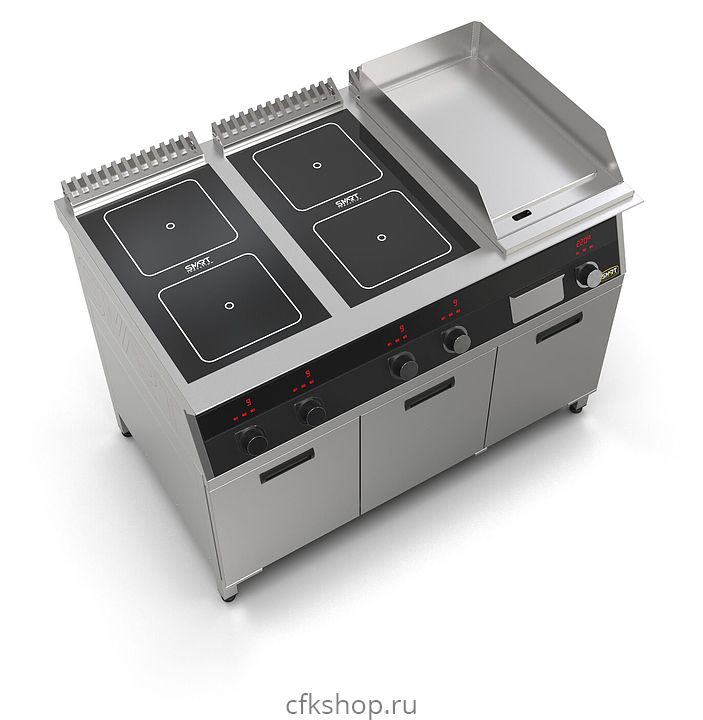 Комбинированная индукционная плита SMART INDUCTION K76-5KPB предназначена для приготовления и быстрого разогрева блюд на предприятиях общественного питания и торговли. Модель оснащена электронно-механической панелью управления с цифровой индикацией и сенсорными кнопками, 3 съемными жировыми фильтрами для отделения жира и влаги от поступающего внутрь аппарата воздуха, 2 ящиками для сбора жира и регулируемыми по высоте ножками. Корпус и столешница выполнены из нержавеющей стали AISI430, рабочая поверхность плиты - из стеклокерамики, рабочая поверхность гриля - из нержавеющей стали, передняя панель имеет стойкое полимерное покрытие черного цвета.
