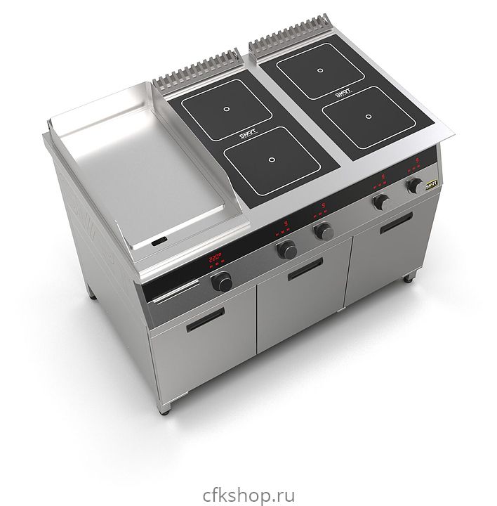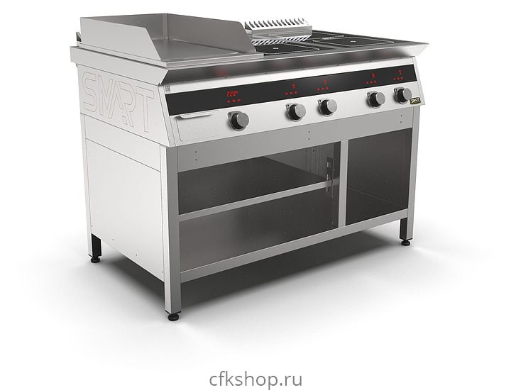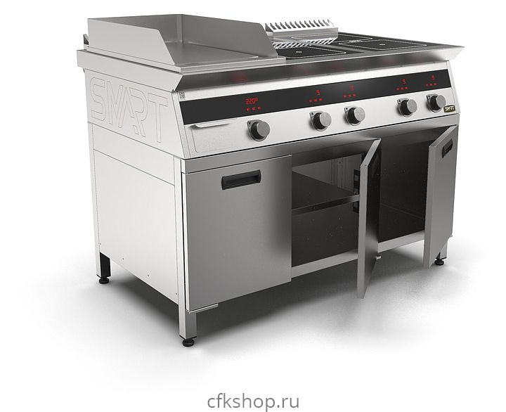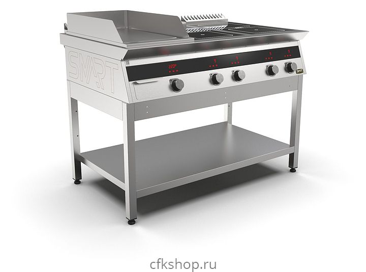 Комбинированная индукционная плита SMART INDUCTION K76-5PKB предназначена для приготовления и быстрого разогрева блюд на предприятиях общественного питания и торговли. Модель оснащена электронно-механической панелью управления с цифровой индикацией и сенсорными кнопками, 3 съемными жировыми фильтрами для отделения жира и влаги от поступающего внутрь аппарата воздуха, 2 ящиками для сбора жира и регулируемыми по высоте ножками. Корпус и столешница выполнены из нержавеющей стали AISI430, рабочая поверхность плиты - из стеклокерамики, рабочая поверхность гриля и передняя панель - из нержавеющей стали.